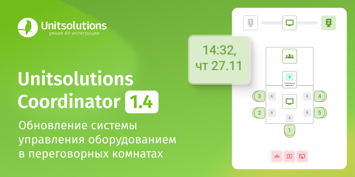 Друзья, рады представить вам новую версию системы управления оборудованием в переговорных комнатах Unitsolutions Coordinator 1.4. В новой версии мы обновили главный экран и добавили новые функции для управления!