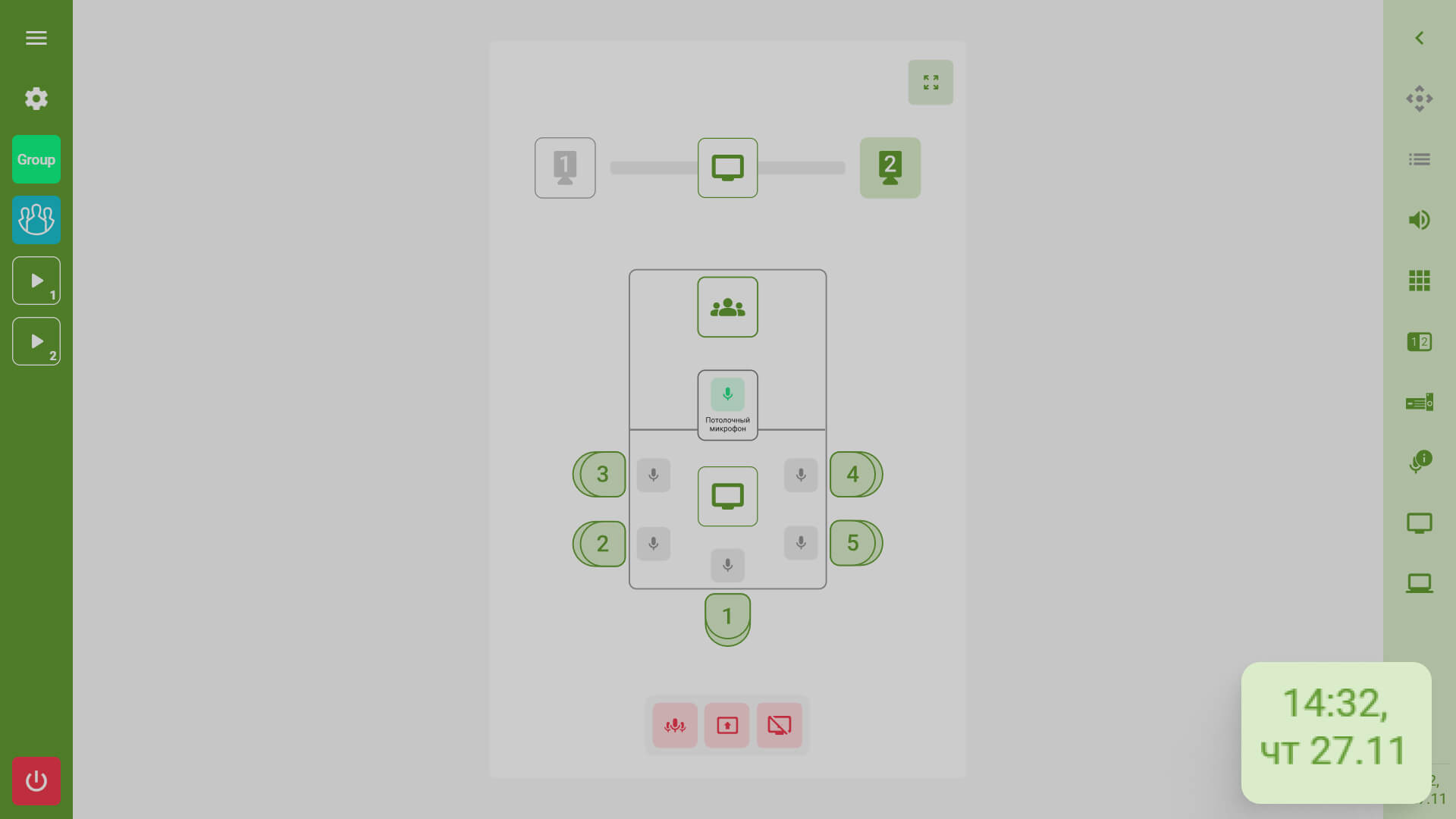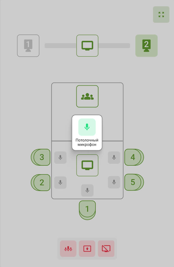 Мы добавили возможность настраивать дополнительные клавиши для прямого взаимодействия с оборудованием. Они позволяют в одно нажатие управлять ТВ-панелями, коммутацией, потолочными микрофонами, положением выдвижных мониторов и другим оборудованием, а также запускать предустановленные сценарии.